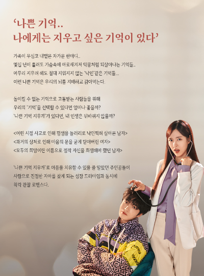MBN 금토 드라마 '나쁜 기억 지우개'는 뇌 수술로 인해 인생이 송두리째 바뀐 남자와 그의 첫사랑이 되어버린 여자의 아슬아슬한 로맨스를 그린 이야기입니다. 드라마 시청의 이해를 돕기 위해서, 등장인물, 인물관계도, 드라마 소개를 정리해드립니다.