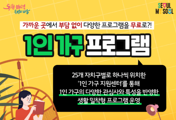 서울시 1인가구 지원 프로그램은 고독과 고립에서 벗어날 수 있도록 지원합니다. 아래의 1인가구 지원센터를 클릭하시면, 많은 프로그램이 있습니다.